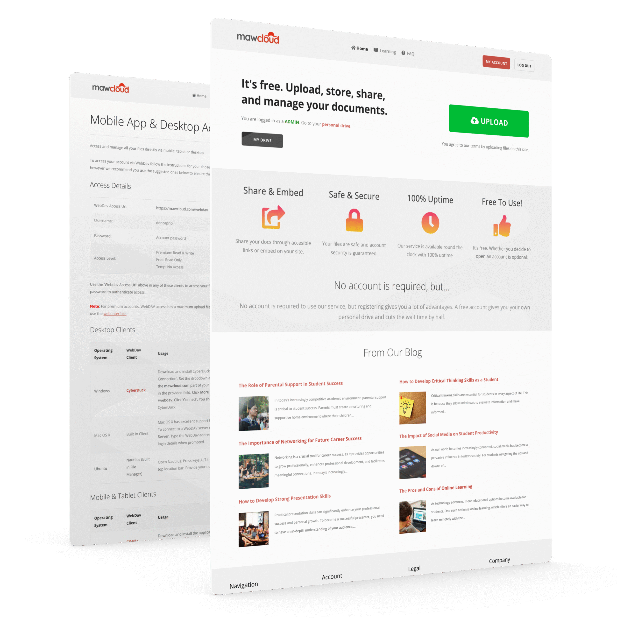 MawCloud.com is a document storage platform that also has a content management system (for assessments and blog articles) built on WordPress. The platform allows users to upload and share documents.